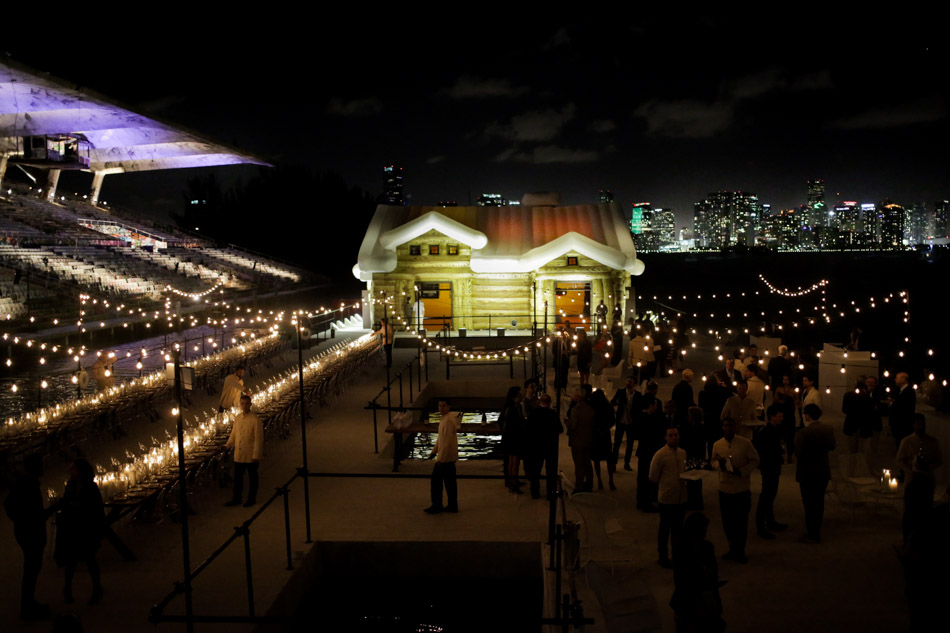 Egy francia duó, a Kolkoz alkotta meg ezt a különleges légvárat a Miami Beachen is megrendezésre kerülő Art Basel rendezvényre, aminek keretén belül kortárs művészeti kiállításokat rendeznek Miamin kívül Hong-Kongban, és Bazelben. A déli part napfényes, vízparti panorámájával kellemes kontrasztot alkotott az úszó színpadra felállított téli faház. A rendezvény ideje alatt a felfújható ház Audemars Piguet prémium óragyártó bemutatótermeként szolgált.