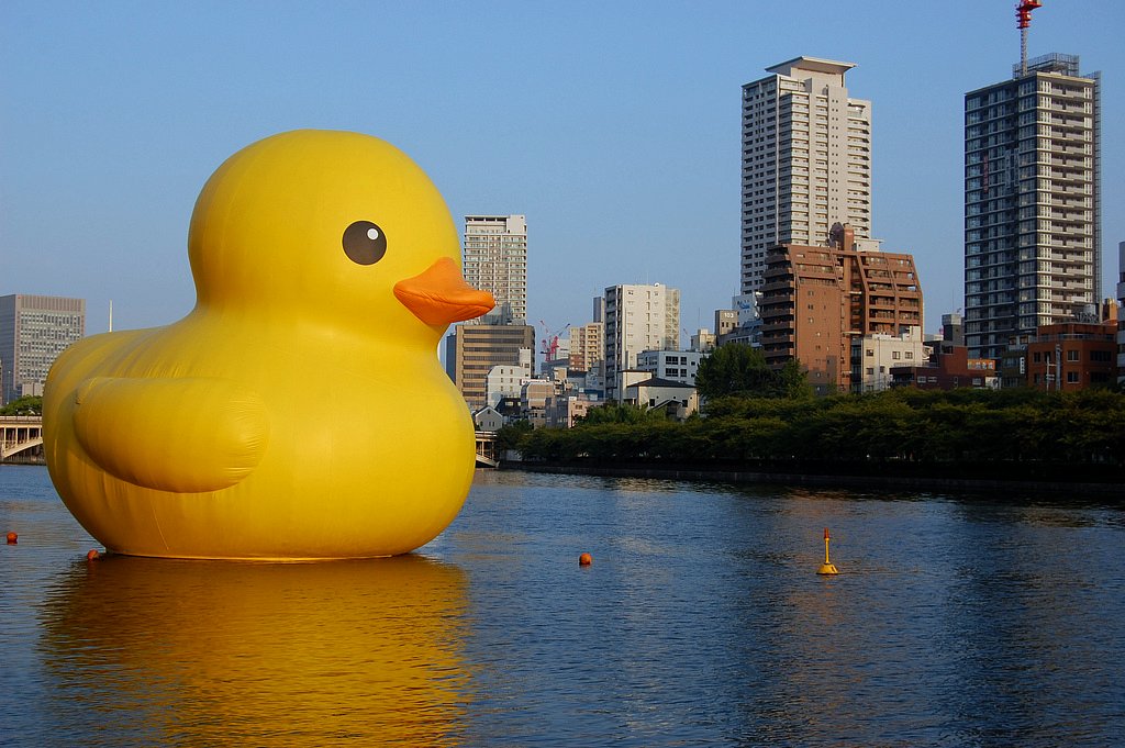 Ennek az óriási, 26x20x32 méteres, 600 kilogrammos kacsának az alkotója a 36 éves, holland származású Florentijn Hofman. Ezt az úszó szobrot az emberek szórakoztatására hozta létre, ezért 2007-ben világkörüli útra bocsájtotta, aminek a „Spreading joy around the world” címet adta, ami magyarul annyit tesz, hogy „Az öröm terjesztése a világ körül”. A kacsa a gyerekkori emlékeket hivatott előcsalogatni mindenkiből, amire minden esélye meg is van. Florentjin szerint alkotása a városi kultúra tökéletes esszenciája, mely megállásra készteti a megszokott útvonalon haladó városlakókat, és spontán közösséget hoz létre a teljesen valószerűtlen jelenség körül. Úgy tűnik bejöttek a számításai, ugyanis hihetetlen népszerűségnek örvendett az alkotás; akármerre is vitték a nagyvilágban, több százezren tülekedtek előtte nap mint nap, sőt, az amerikai Pittsburgh városában több mint 1 millióan nézték meg! Amúgy ez volt az első Egyesült Államok-beli város, ahol a „kis” kacsa megjelent.