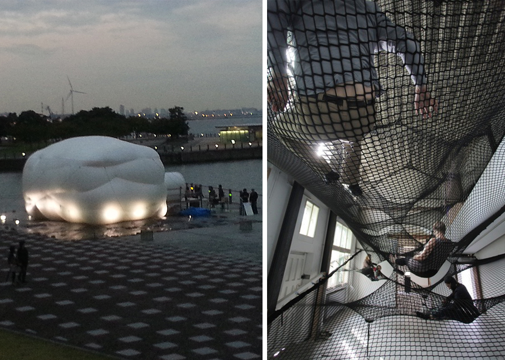 A felfújható változat megszületése előtt kísérleteztek egy vasszerkezetek közé feszített hálórendszerrel, ahol a vasszerkezet különböző múzeumok falaihoz volt rögzítve. „Olyan volt, mintha bombázták volna a falakat”- mondja. „Folyamatosan javítgatnunk kellett.”